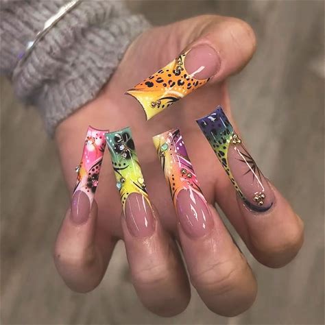 24Pcs Press On Nails Long Colorful Gradient Fake Nails Square False Nails With 3D Embossed Designs Acrylic Nails Full Cover Nail For Women