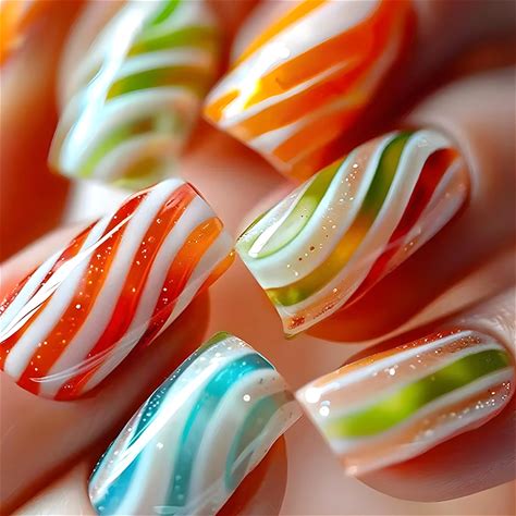 24Pcs Summer Press On Nails Medium Square Fake Nails With Colorful Candy Designs Gradient Acrylic Nails Rainbow Stripes Glitter False Nails Full Cover