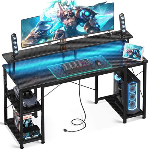 HLDIRECT 47 Inch Gaming Desk With LED Lights, Ergonomic Computer Gaming Table With Carbon Fibre Surface, Sturdy PC Workstation Desk For Home Office
