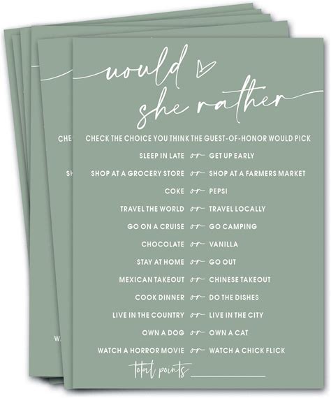 Wybgno Bridal Shower Games Cards, Would She Rather Bridal Shower Game For 25 Guests, Engagement Party Wedding Games For Guests, Minimalist Green